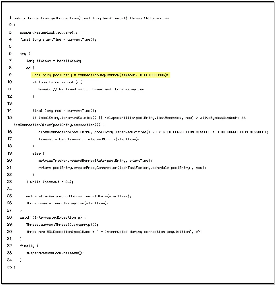 首先来看图7,图中的 getConnection(final long hardTimeout)方法,是获取数据库连接的入口方法,位于 com.zaxxer.hikari.pool.HikariPool 类中,其中最重要的是 Line 9,从 connectionBag(com.zaxxer.hikari.util.ConcurrentBag 的实例) 中借出(borrow)一个连接(PoolEntry)。要么借出成功,要么等待timeout毫秒后超时,返回一个空值null。